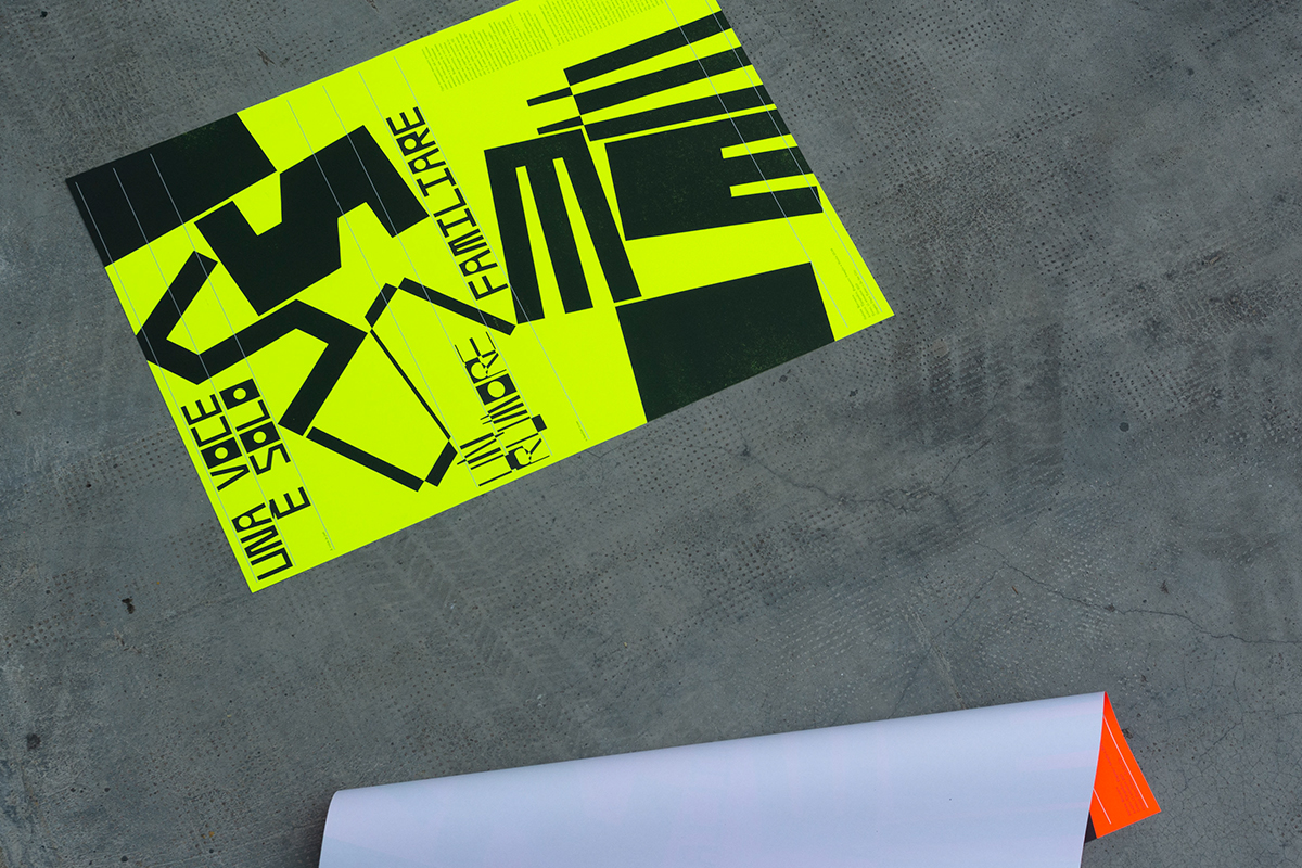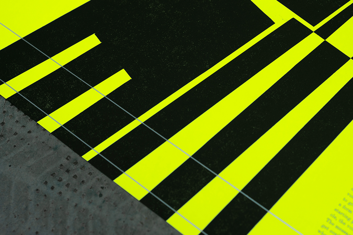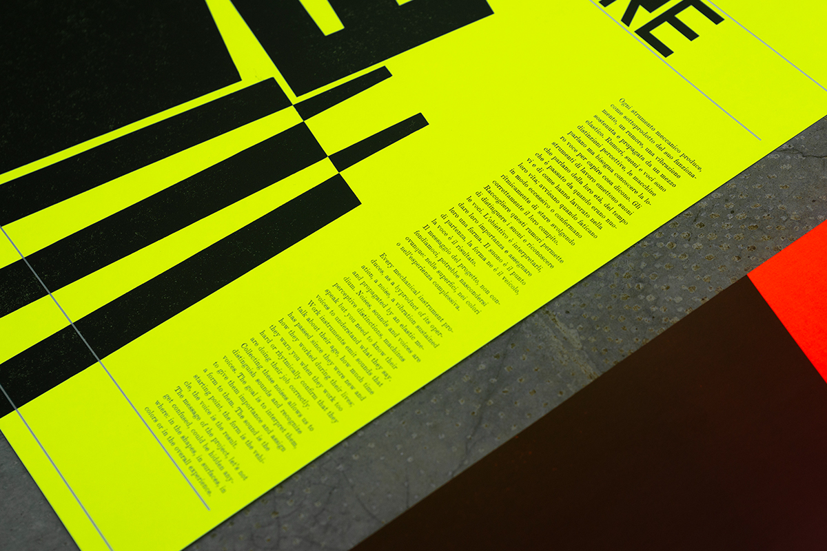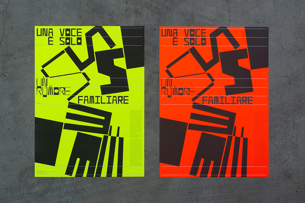 A poster printed live on the occasion of the first premiere of the tracks, as an audiovisual installation within the walls of Archivio Tipografico on 11th of September 2019. Entirely printed in letterpress with movable type, polymer plates and hand-cut matrices. Available in neon yellow and neon red. “Every mechanical instrument produces, as a by-product of its operation, a noise, a vibration sustained and propagated by an elastic medium. Noises, sounds and voices are perceptive distinctions, machines speak but you need to know their voice to understand what they say. Work instruments emit sounds that speak of their age, the time that has passed since they were new; they warn when they work too hard or rhythmically confirm they are functioning correctly. We've tried to collect these noises, distinguish sounds and recognize voices. The goal is to give them importance and to assign them a form. The sound is the starting point, the form is the vehicle, the voice is the result. The message, let’s not get confused, could be hidden everywhere in the project: in the shapes, in surfaces, in colours or in the overall experience.”