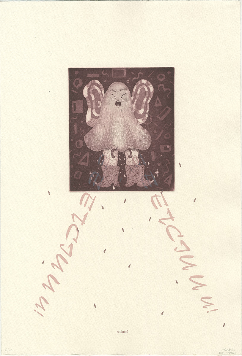 The illustration, made with the engraving technique, captures every detail, while the text ‘Etciù!’ with its accents and apostrophes were printed with movable type, maintaining the same colour palette for a consistent and lively result.