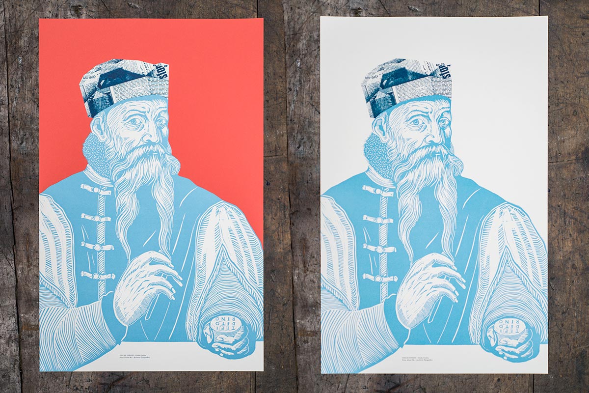 Promotional poster printed for the presentation of “Tipi di Torino”, a project carried on with Giulia Garbin and Print About Me to present the story of the local typographers. Printed with linocut, silkscreen and movable type composition. Available with orange or white background. Print About Me and Archivio Tipografico led Giulia to discover stories related to the Turin typographic scene, past and present. Thus was born a volume (currently sold-out) in which the stories of five characters are narrated and illustrated, which recount the splendour, decline and rebirth of typographic printing in Turin: a collection of local stories and legends. Everything does not run on the tracks of nostalgia, but rather recovers ancient - but not passed - traditions and techniques, to the rediscovery of the art of typography and the culture of the artist’s book.