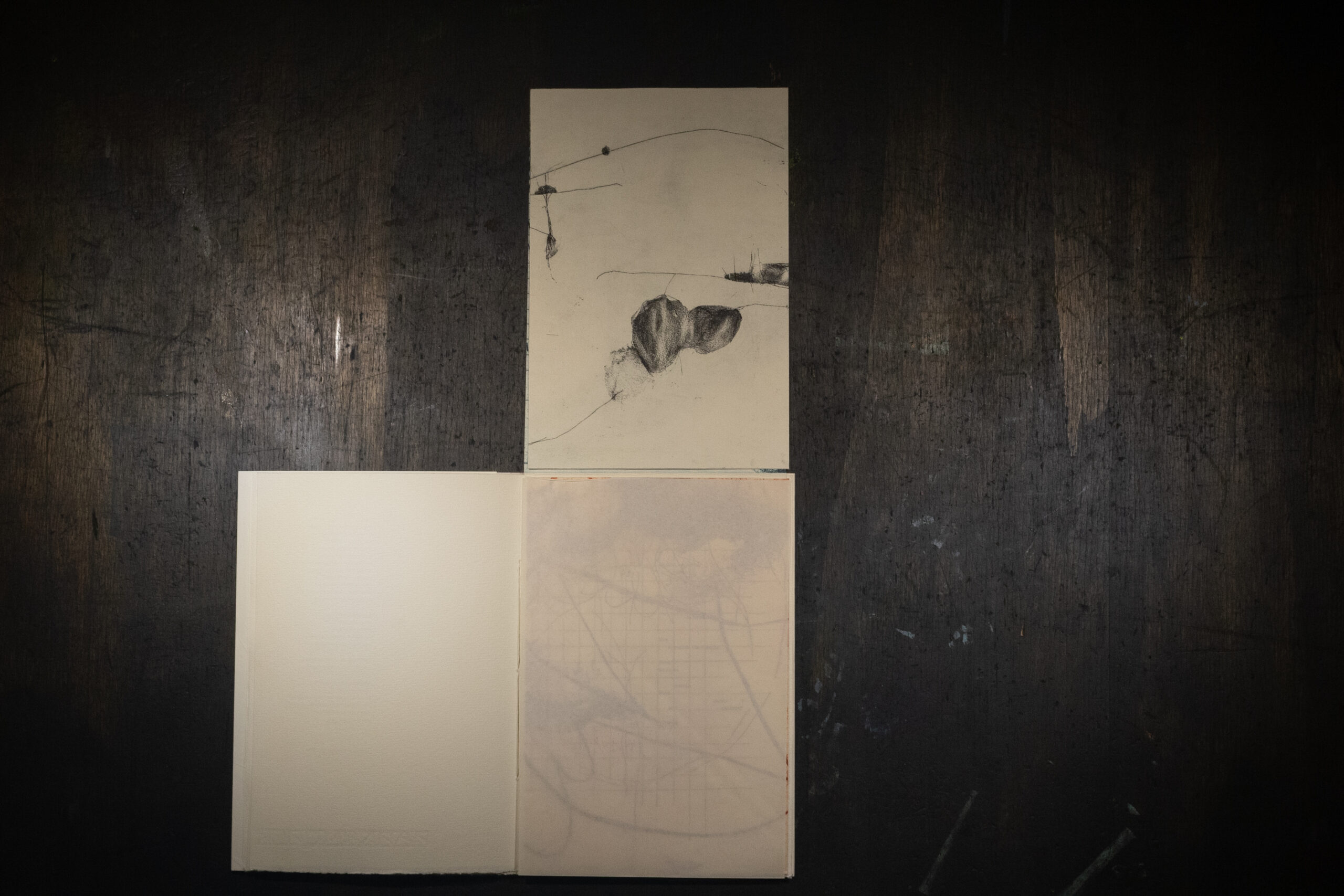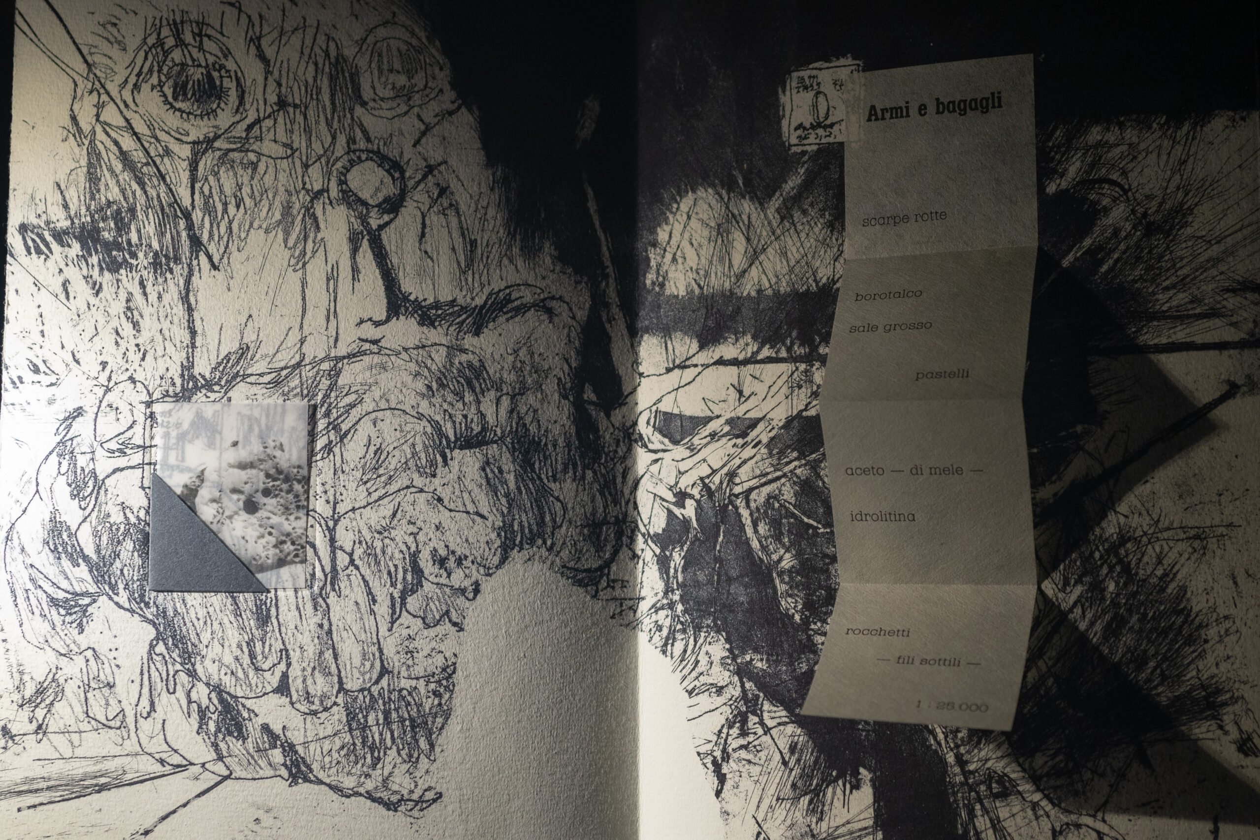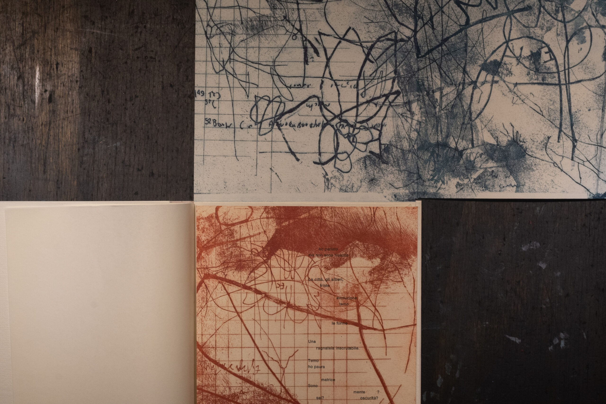 Sommersa is an artist’s book meant to be entered barefoot. Like a flowing stream, the marks, engravings, and words will appear in transparency, through their stratifications. Even what was erased may return, perhaps in new forms.