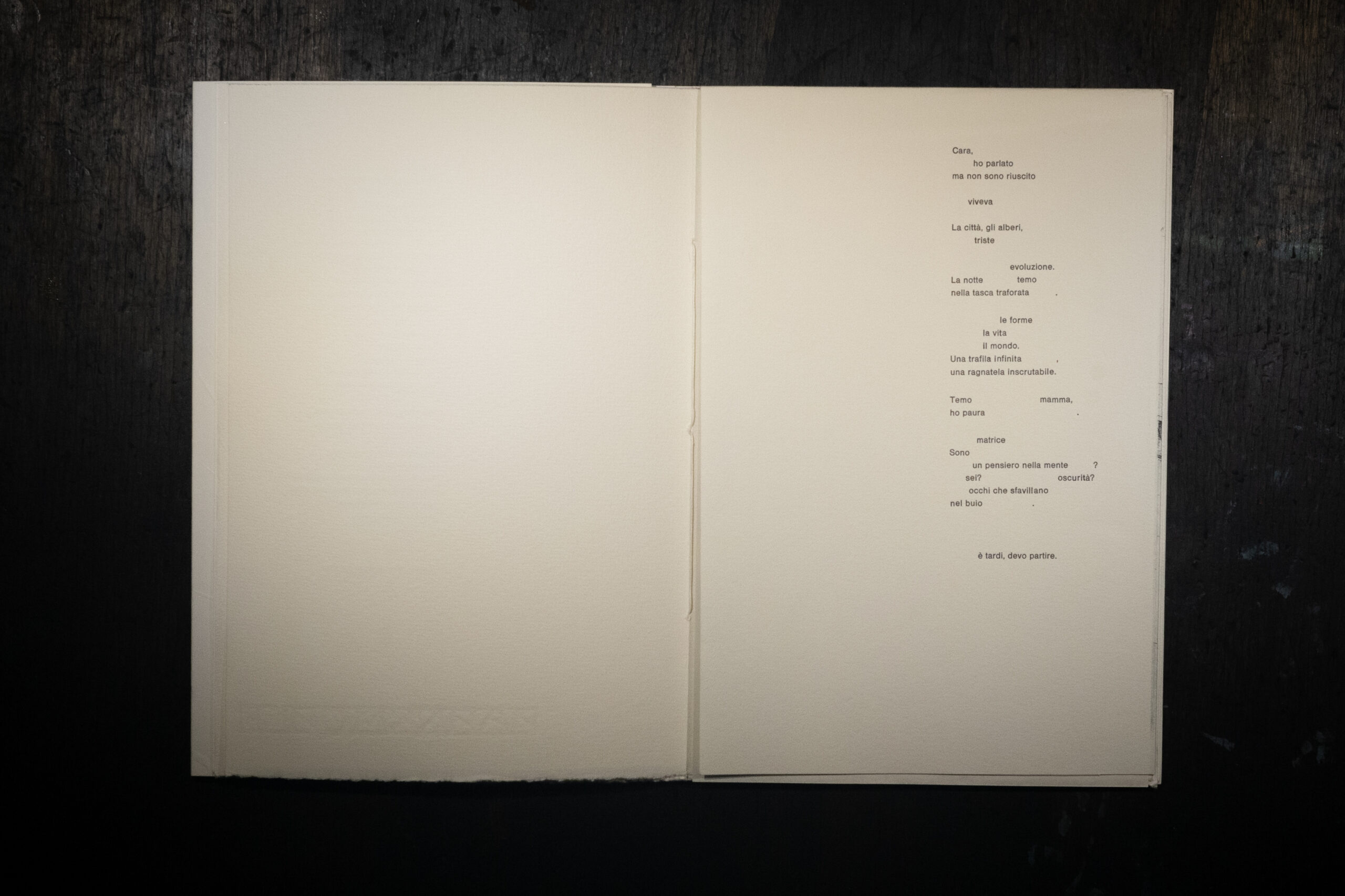 It consists of a series of art books designed and printed by people who attended the Graphic Arts course, under the supervision of Sonia Gavazza, with texts curated by participants from Scuola Holden. Alongside the artistic printing carried out at the Academy, the project included the design and printing of texts using movable type, as well as binding and assembly at Archivio Tipografico.