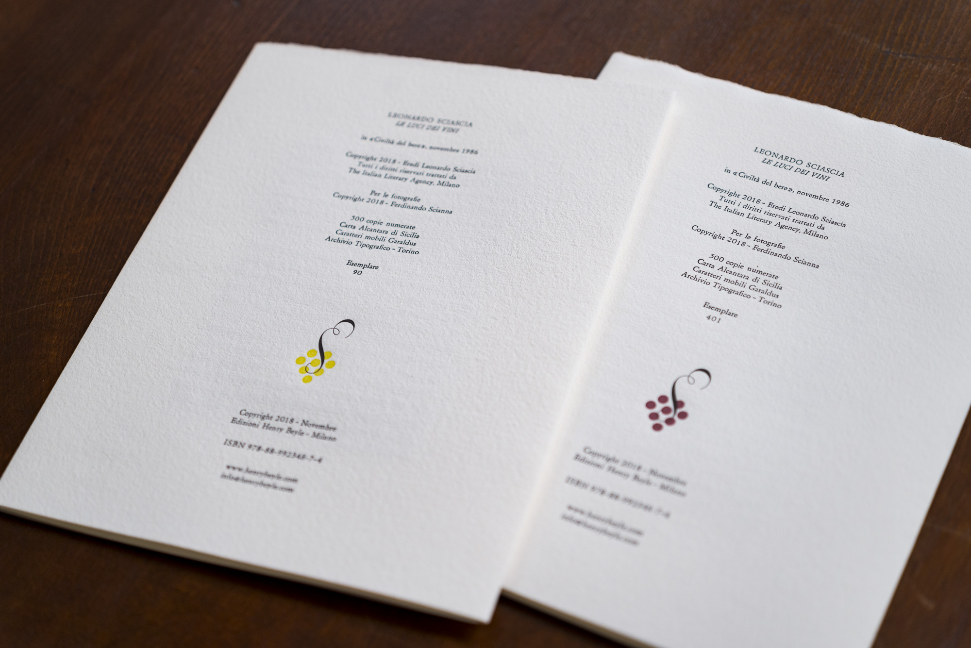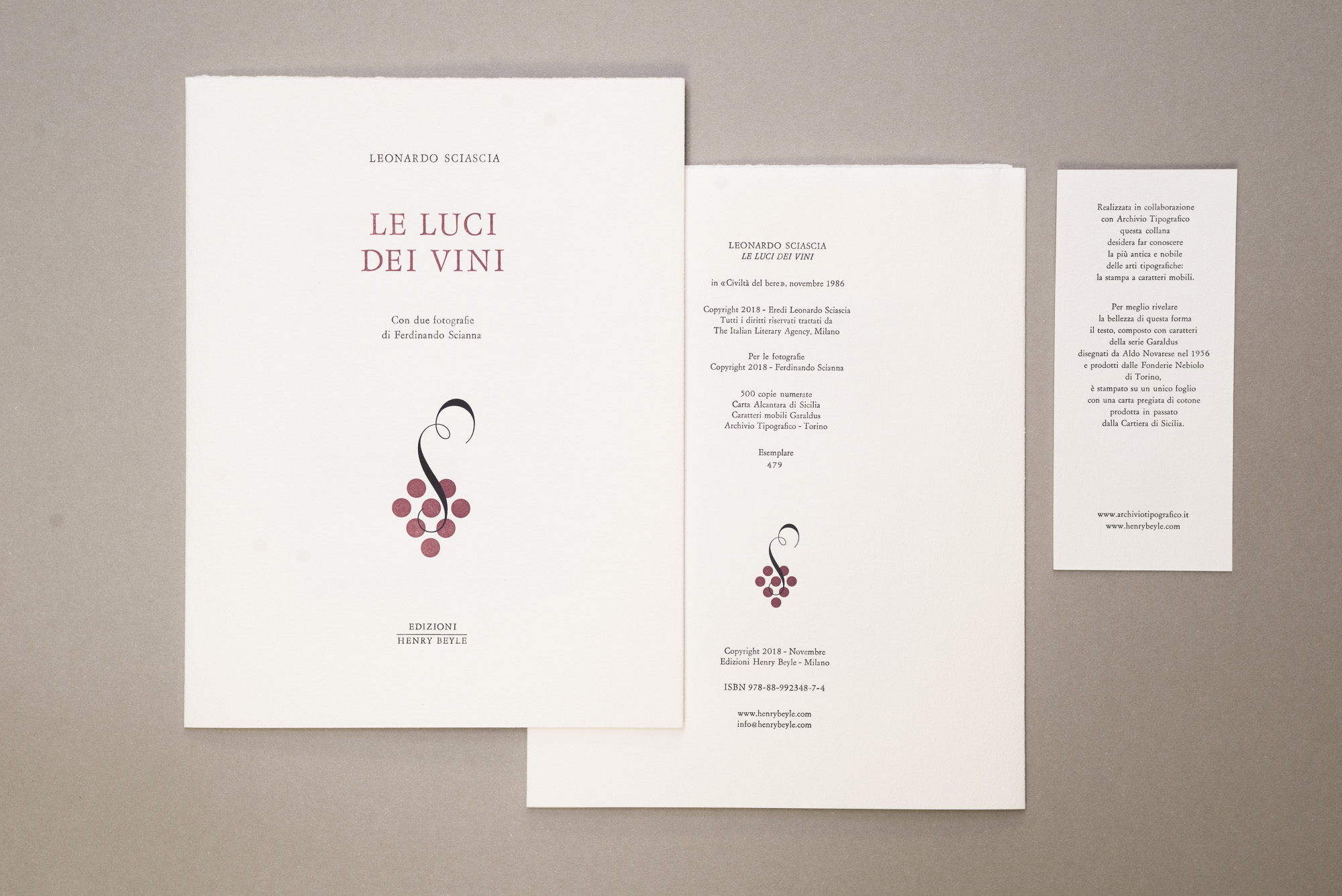 The edition reproduces a text by Leonardo Sciascia, originally published in 1986 in the historic Italian journal of oenology and gastronomy Civiltà del bere.