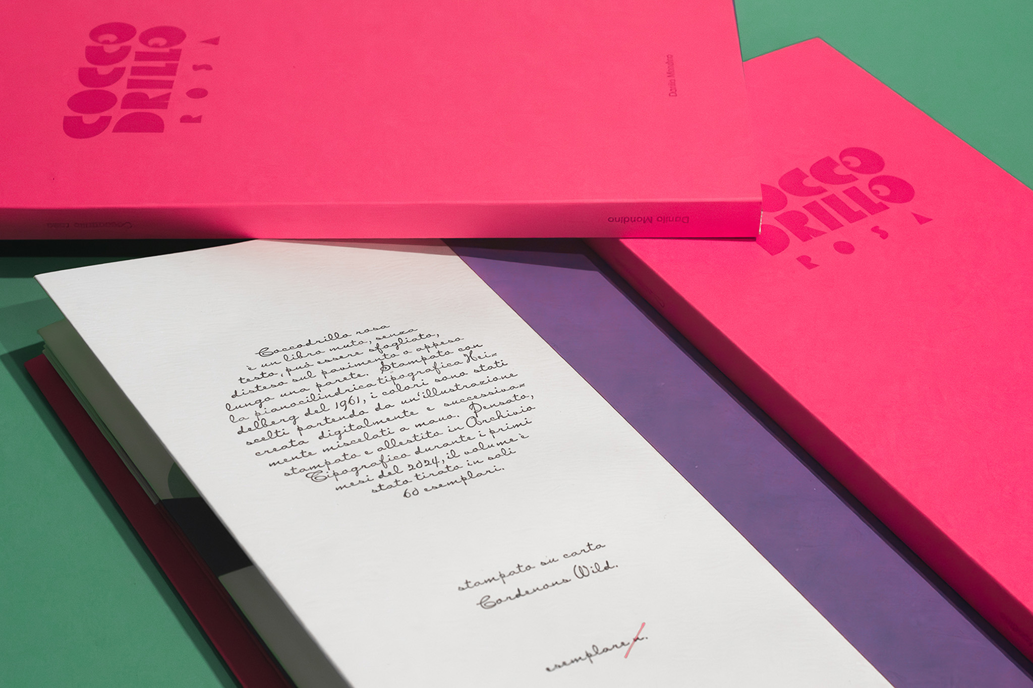 Coccodrillo Rosa è un libro muto, senza testa, può essere sfogliato, disteso sul pavimento o appeso lungo una parete.
