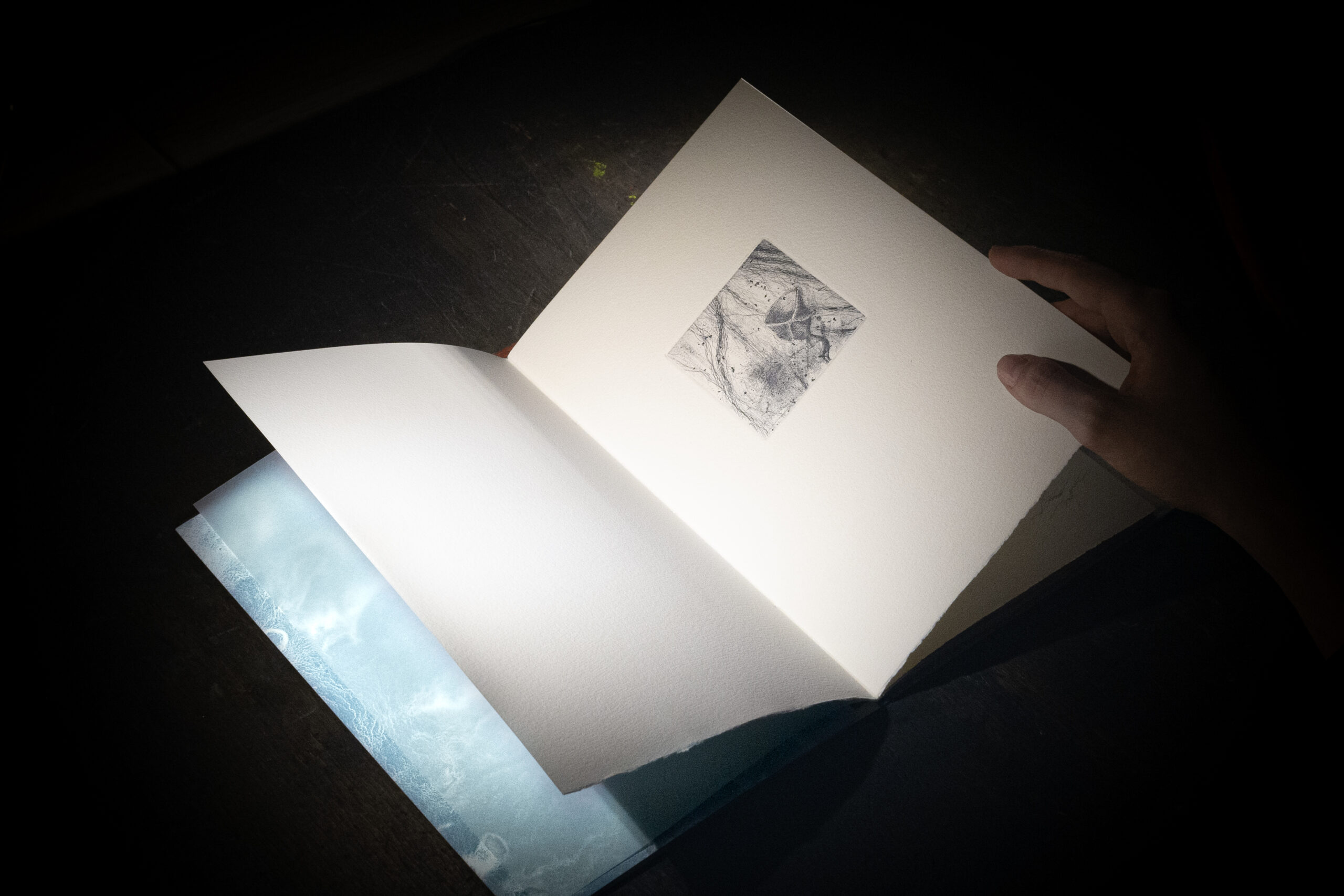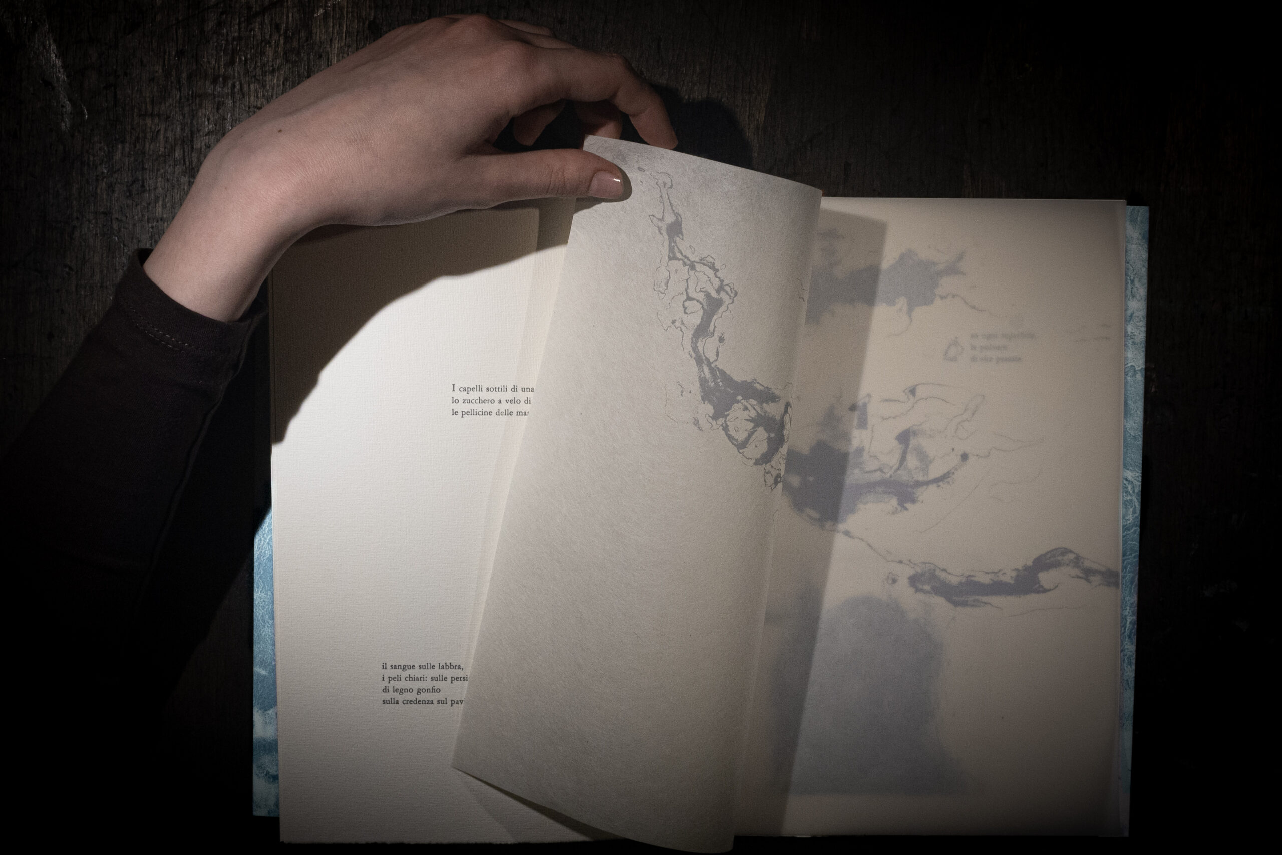 Sommersa è un libro d’artista in cui entrare a piedi nudi. Come un flusso, i segni, le incisioni,le parole, si mostreranno in trasparenza dietro alle loro stratificazioni. Anche ciò che è stato cancellato tornerà, forse, in altre forme.
