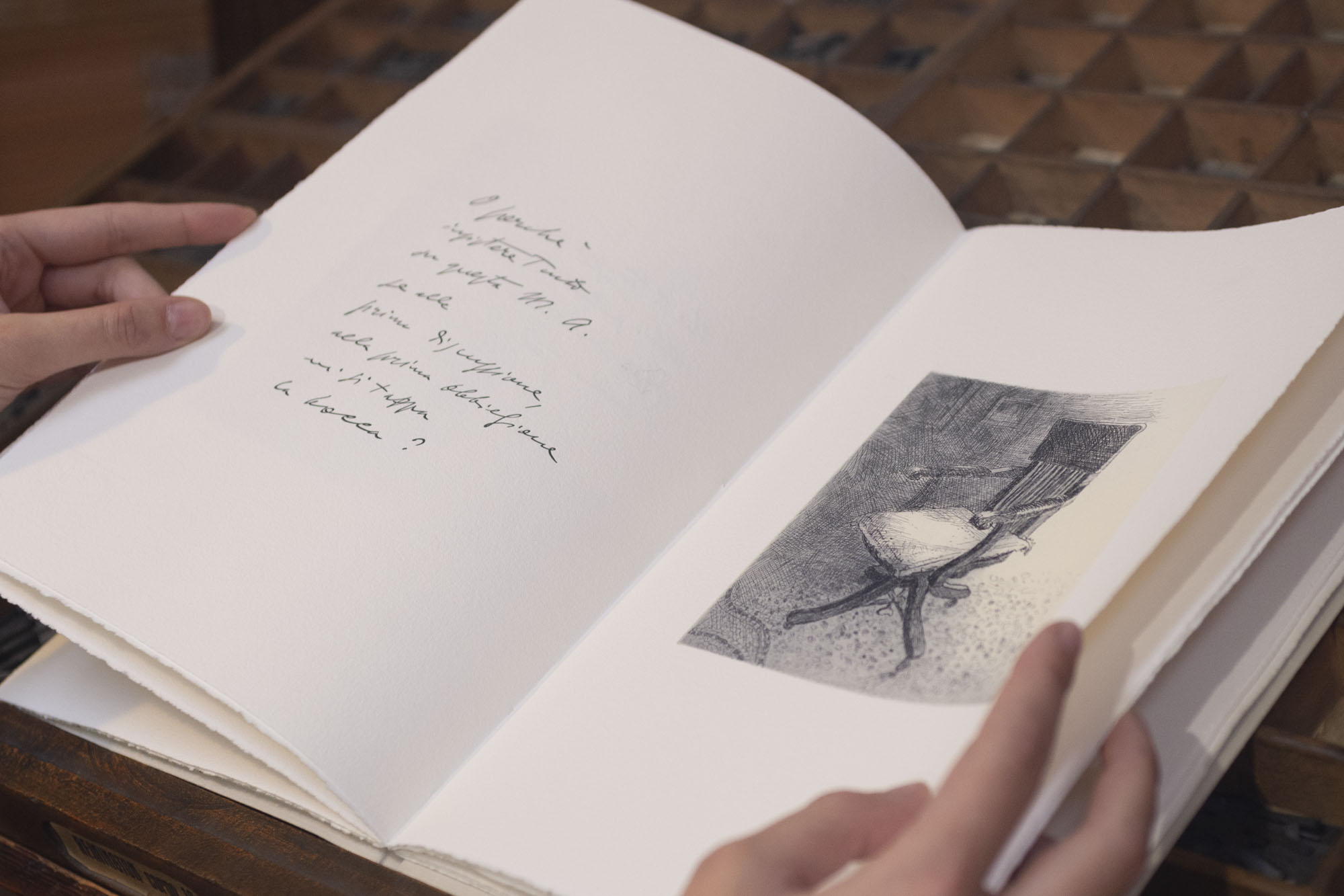 Il libro si sviluppa in una narrazione a più livelli: la lettera viene riprodotta utilizzando lastre fotopolimeriche per preservare la grafia e l’espressività originali, quindi scomposta in brevi passaggi, la trascrizione della lettera segue immediatamente la riproduzione.